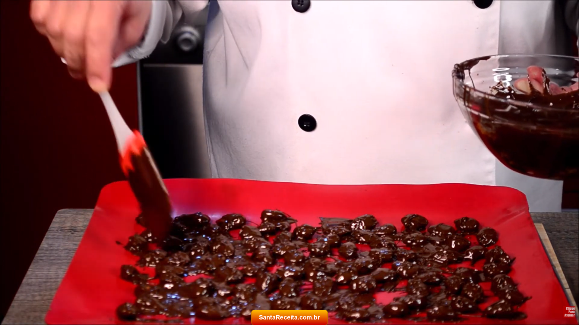 • Utilizando uma espátula ou colher espalhe muito bem as amêndoas e separe-as antes do chocolate endurecer.