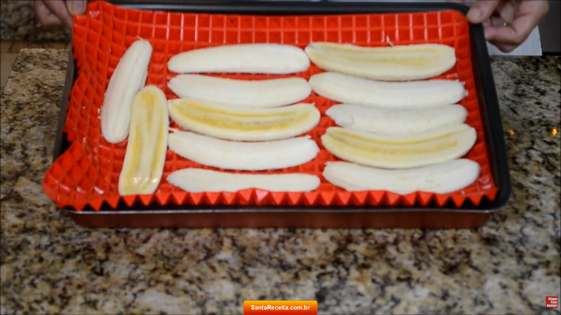- Coloque e ajeite as fatias das bananas lado a lado em uma assadeira forrada com tapete culinário de silicone ou com papel manteiga.