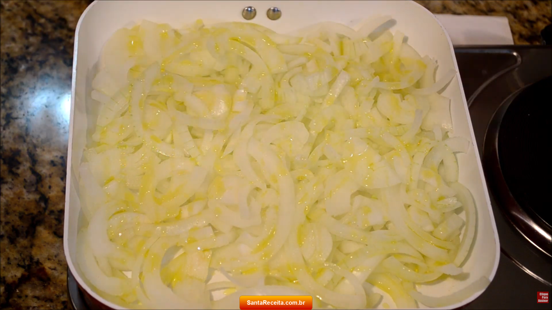• Em uma panela ou frigideira grande no fogo baixo coloque 2 colheres de azeite e as cebolas cortadas e com as fatias separadas.
