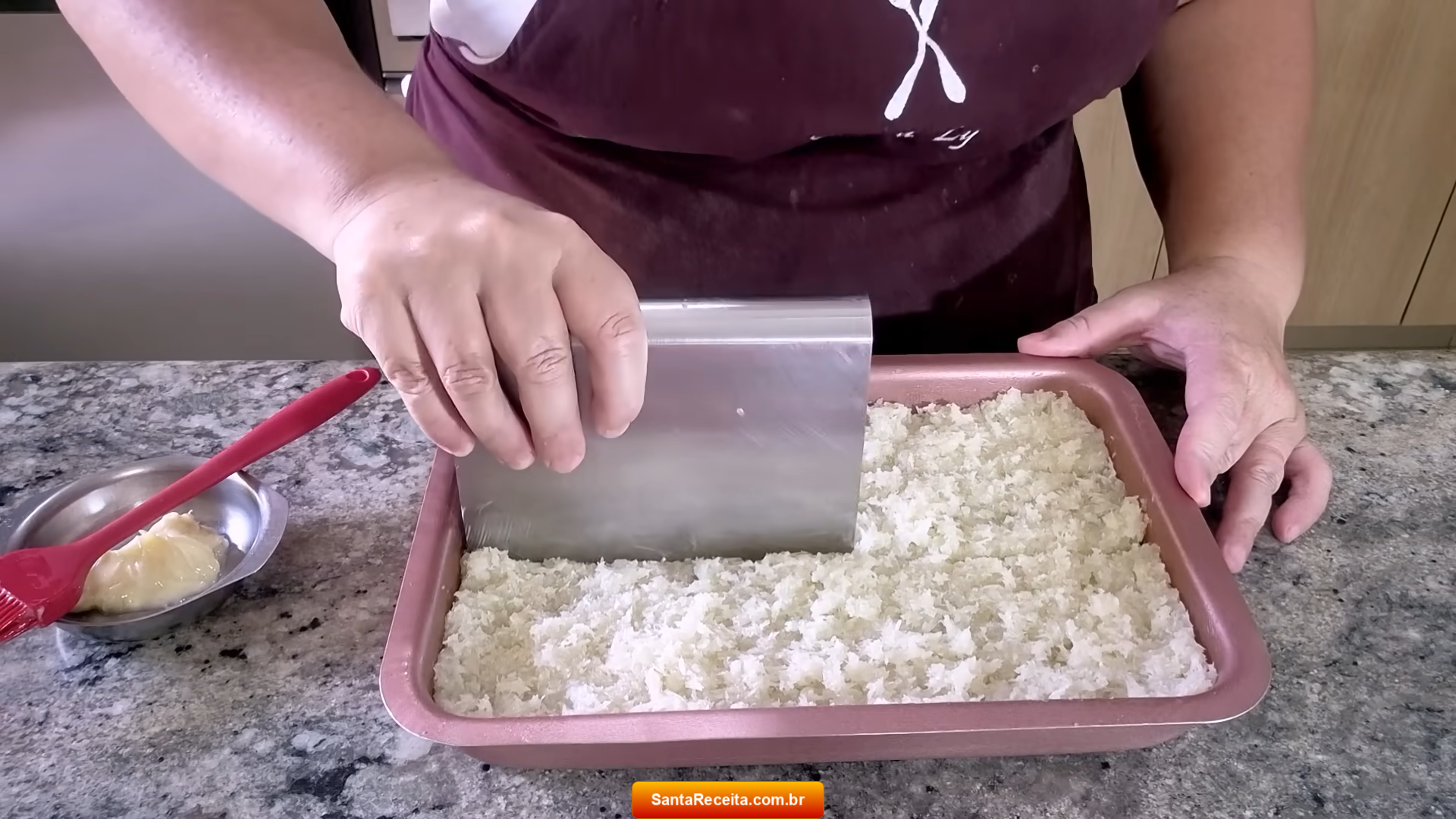 - Transfira o doce para uma forma untada com manteiga ou margarina, espalhe bem e deixe esfriar por 20 minutos.