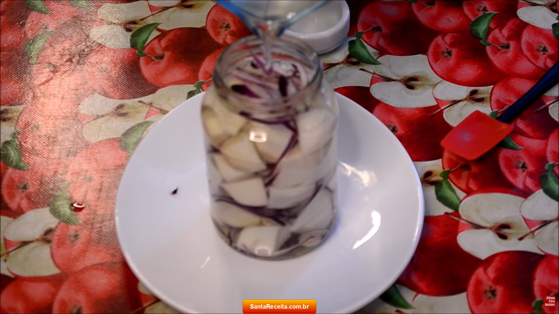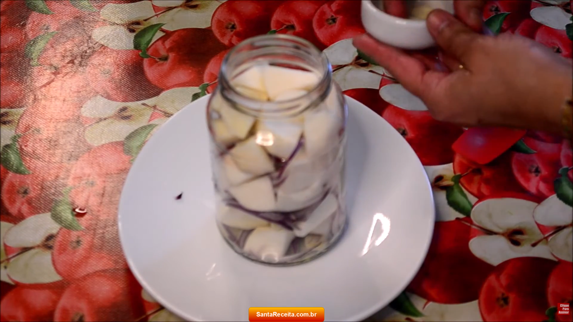 - Em um frasco de vidro esterilizado, coloque algumas fatias de alho. Em seguida adicione algumas fatias de cebola roxa e depois alguns pedaços de nabo.