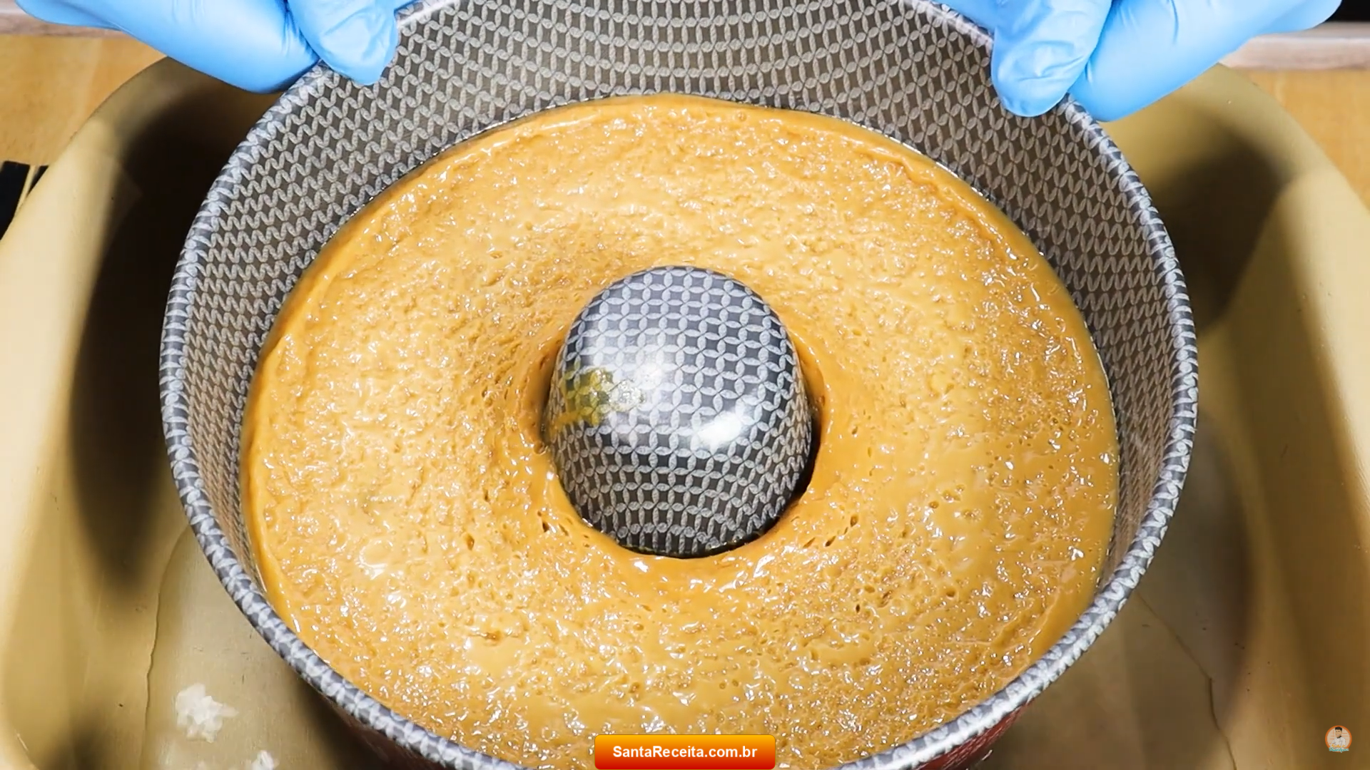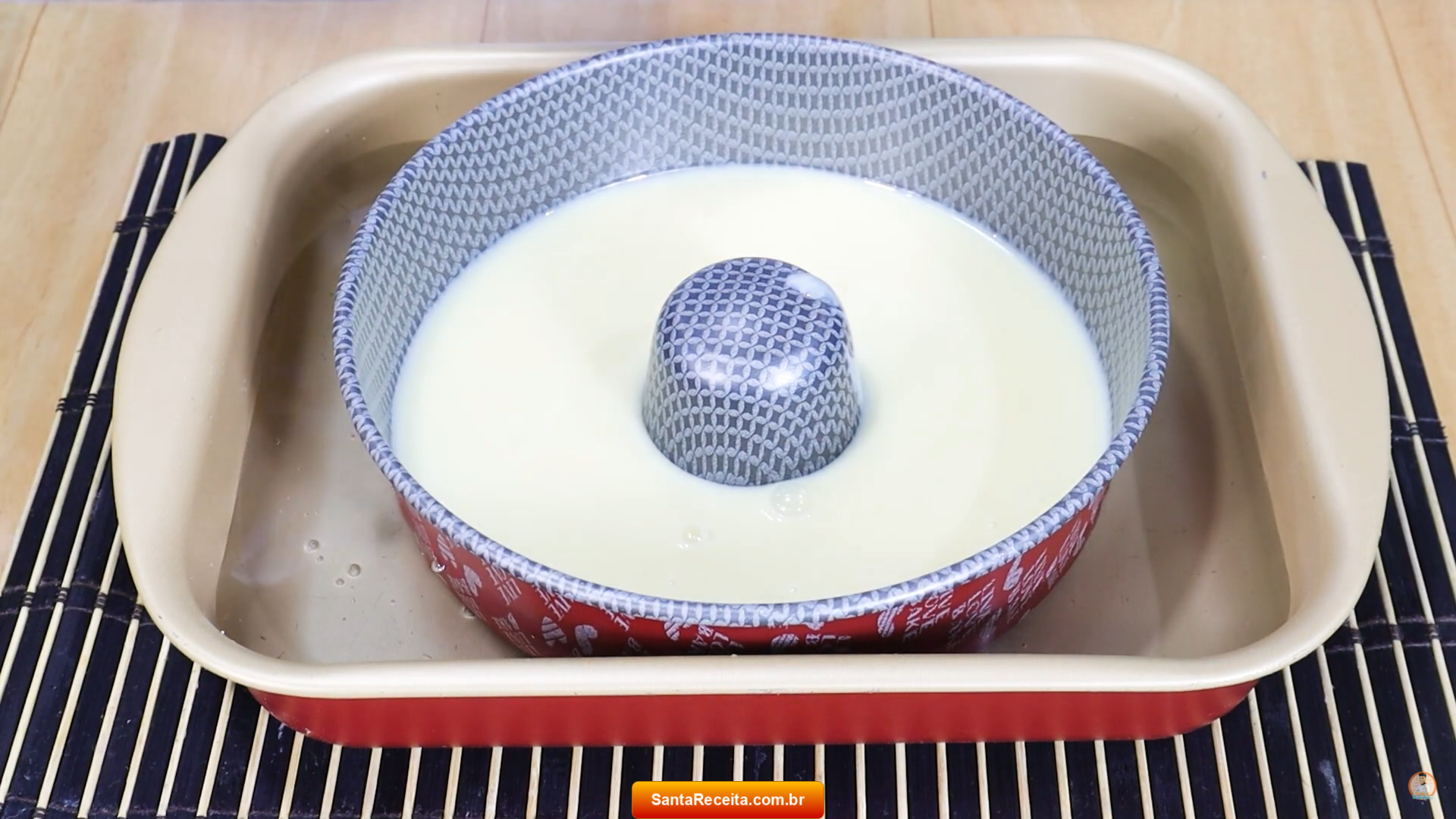 - Em uma forma maior acrescente água quente e coloque a forma com o leite condensado dentro.