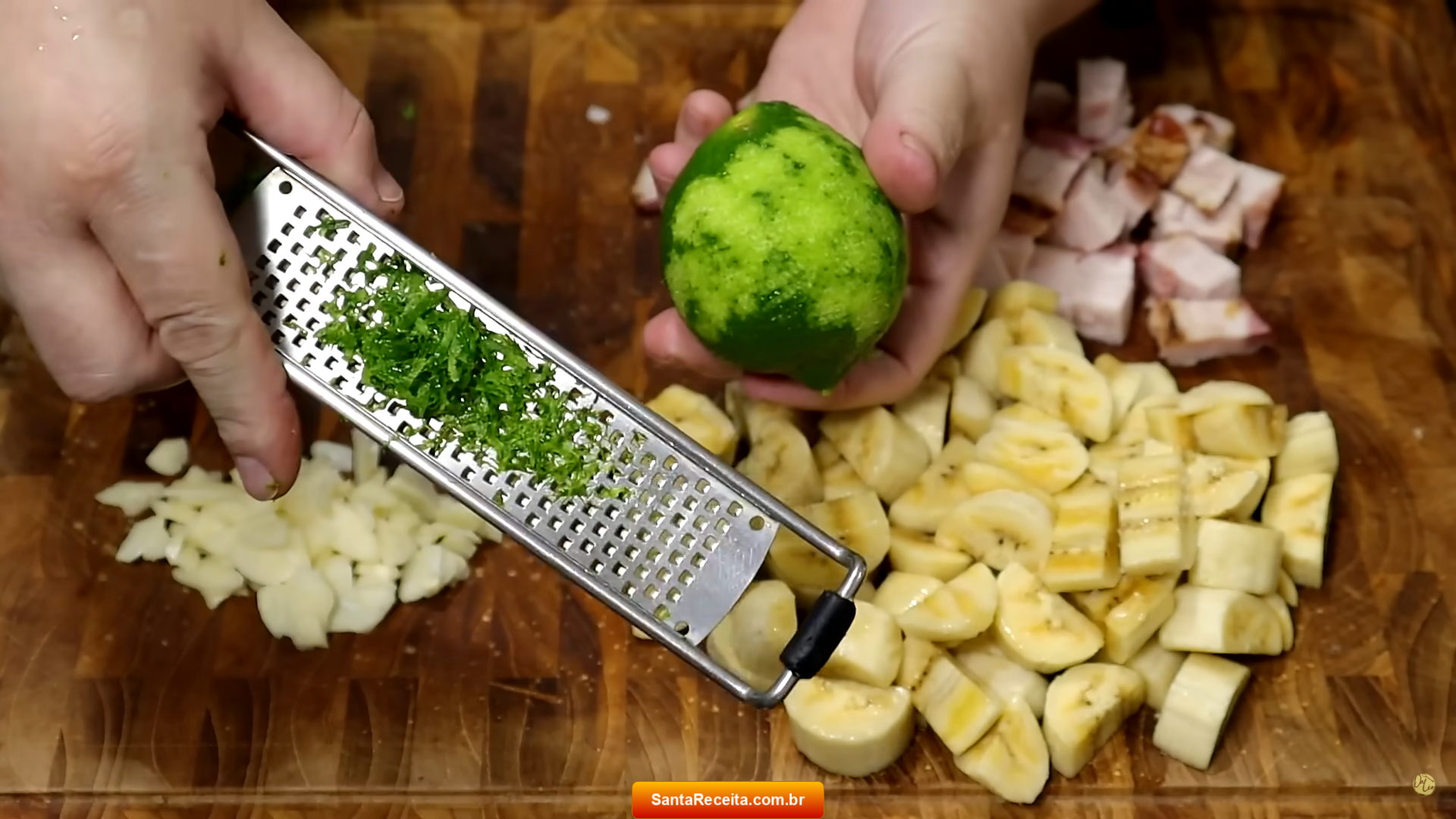 • Pique os alhos descascados em fatias finas e raspe a casca do limão higienizado com um ralador.