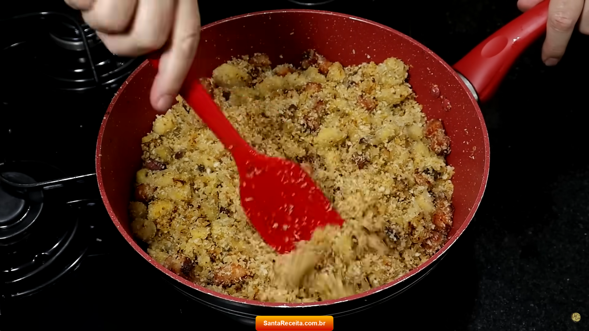• Reduza para fogo baixo e siga mexendo bem por alguns minutos até a farofa secar e ficar crocante.