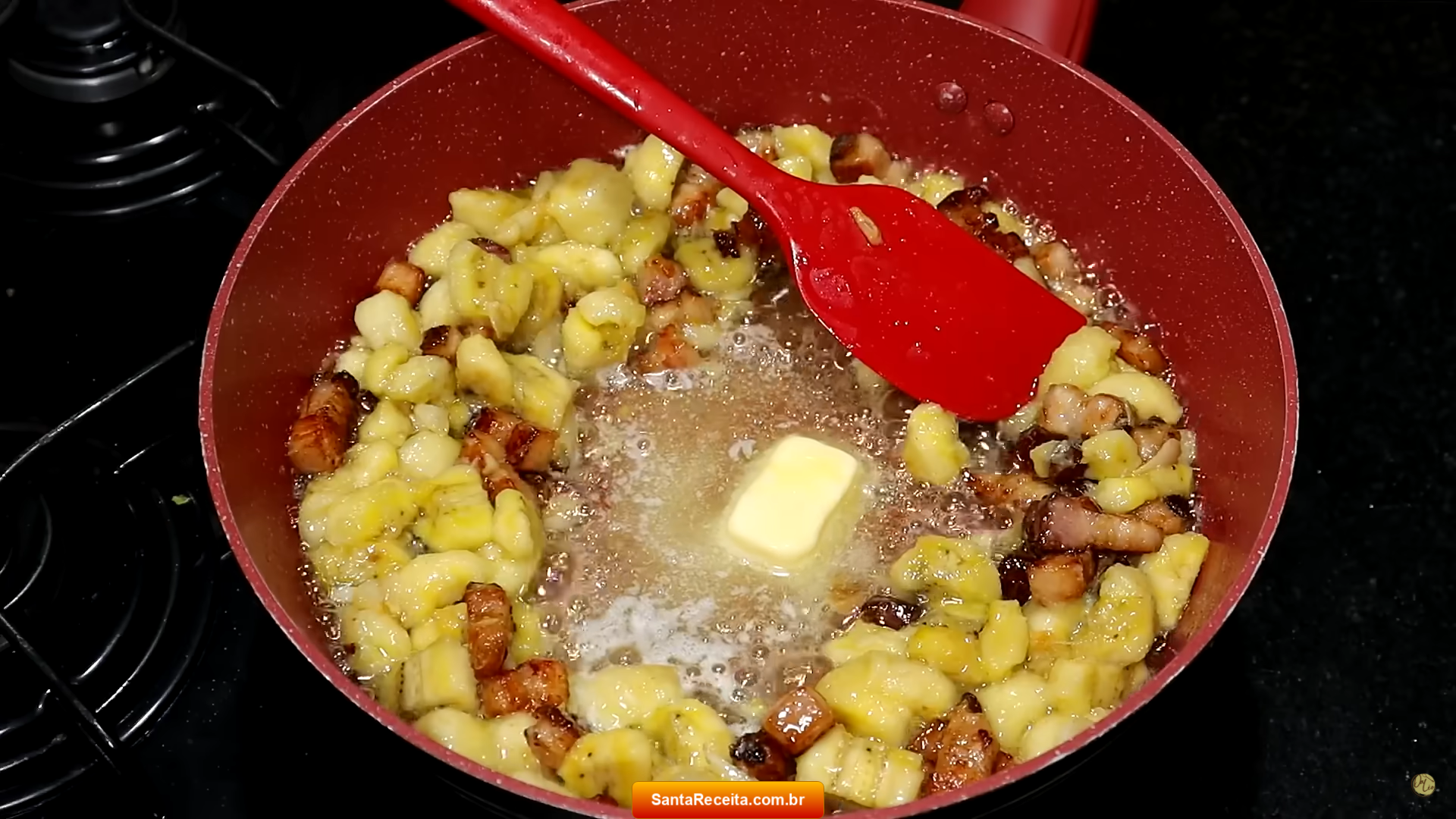 • Acrescente as bananas e refogue-as mexendo bem. Coloque a manteiga, mexa um pouco e deixe derreter.