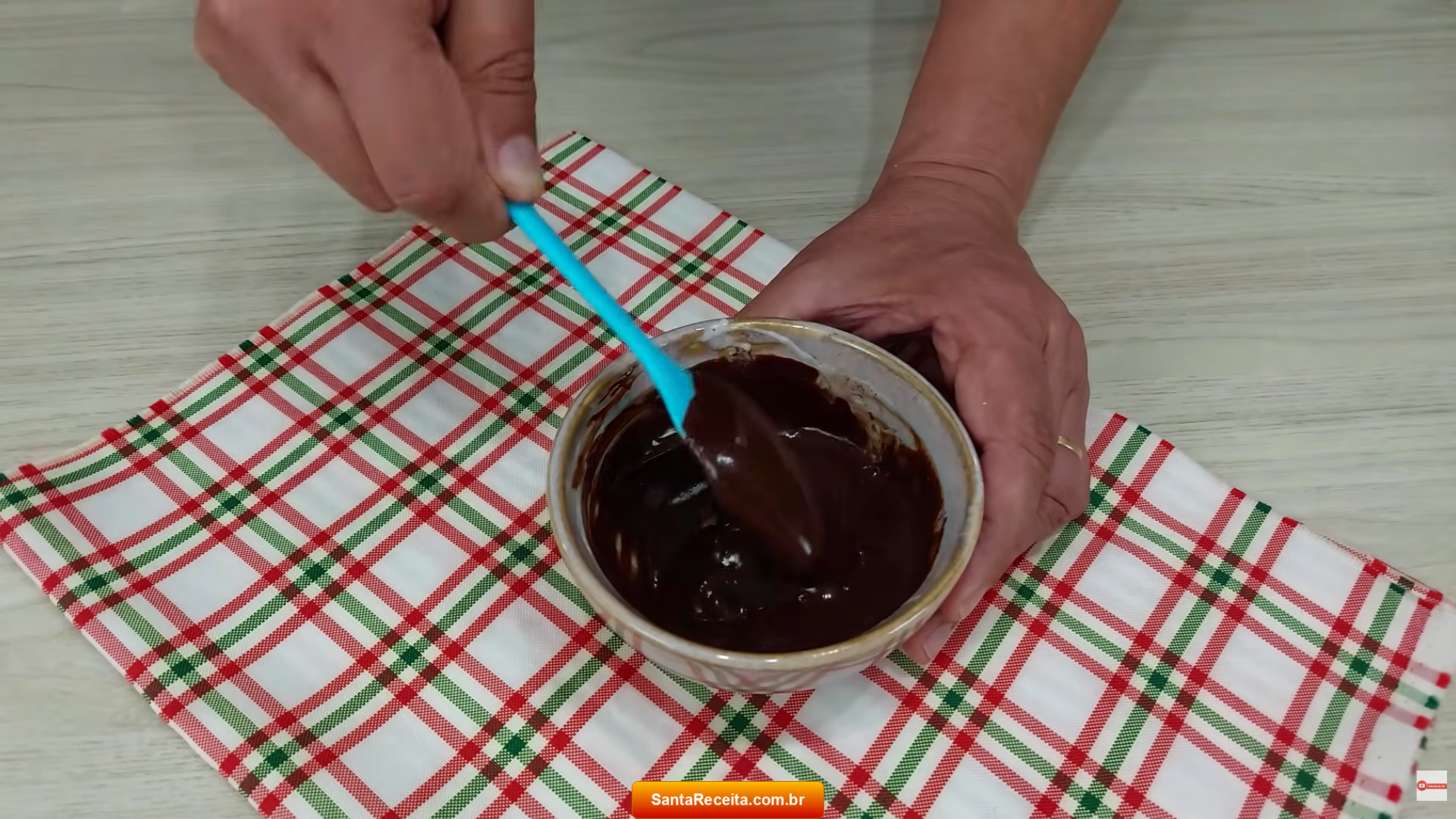 - Aqueça o chocolate meio amargo picado com 1/4 de caixa de creme de leite no micro-ondas por 30 segundos. Mexa até derreter e homogeneizar.