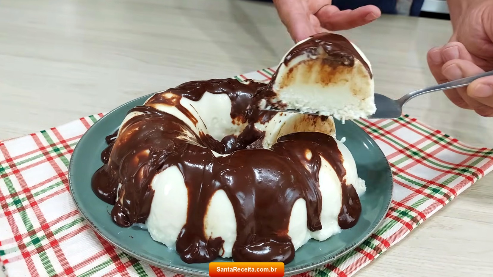 - Desenforme a sobremesa em um prato ou travessa e cubra com a ganache de chocolate após ela esfriar.