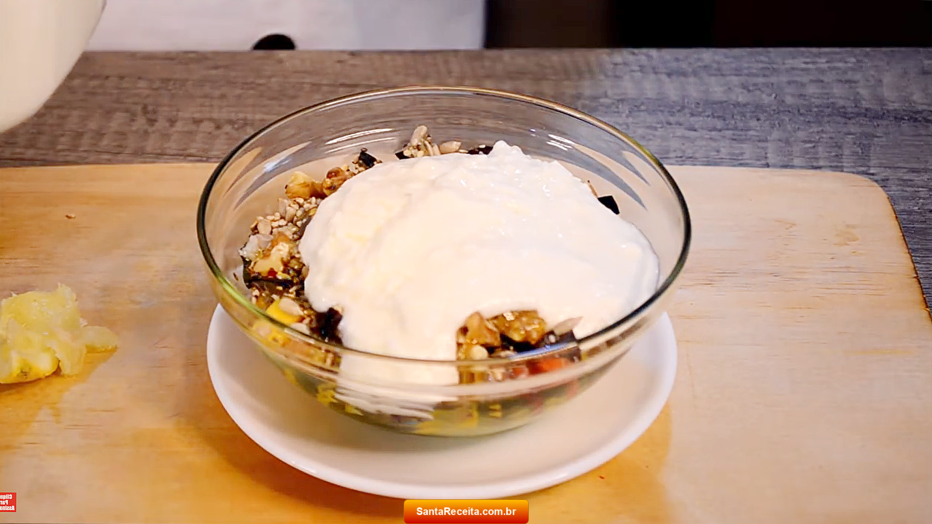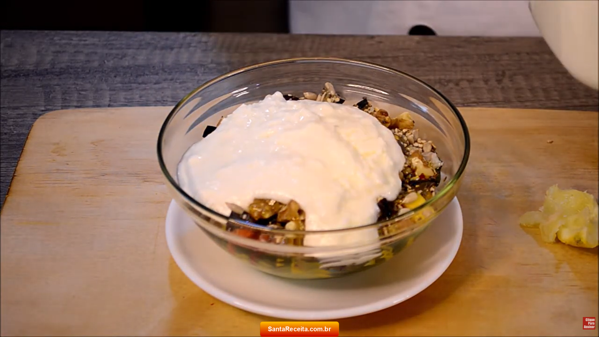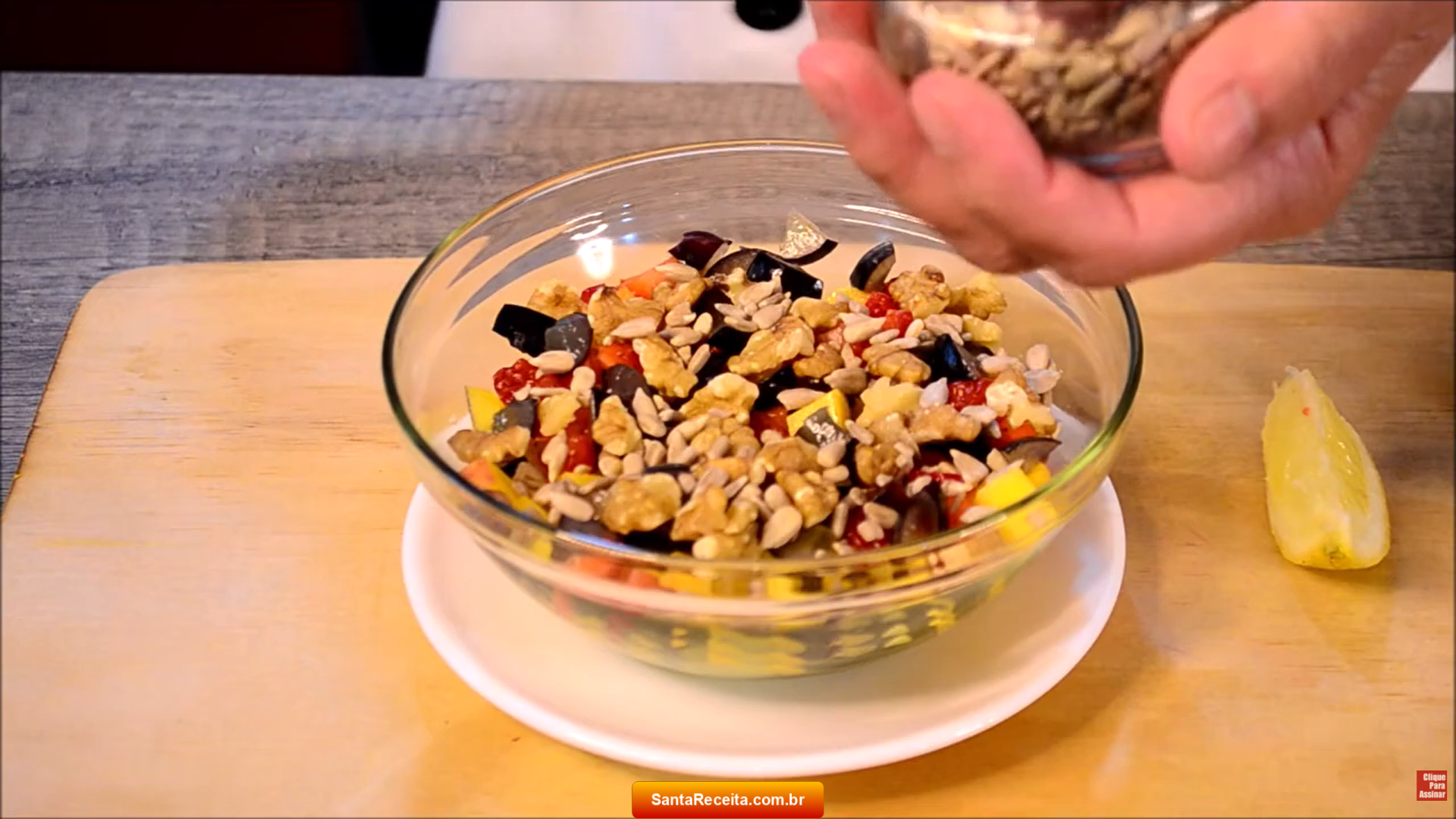 - Adicione em uma tigelas as frutas de sua preferência picadas em cubos, as amêndoas e nozes picadas e os grãos variados.