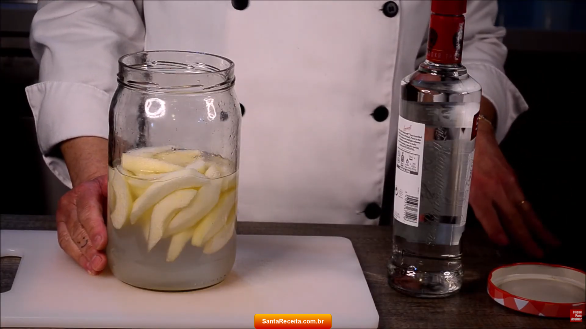 - Transfira a calda de açúcar para o frasco de vidro onde o licor será preparado. Coloque as peras fatiadas descascadas.
