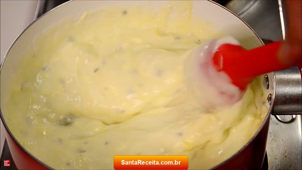 - Junte o creme de leite, misture bem e acrescente o macarrão já cozido e escorrido.