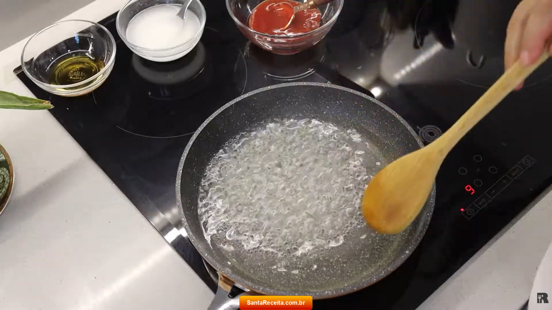 - Adicione o vinagre e misture. Acrescente o ketchup e cozinhe mexendo bem até incorporar.