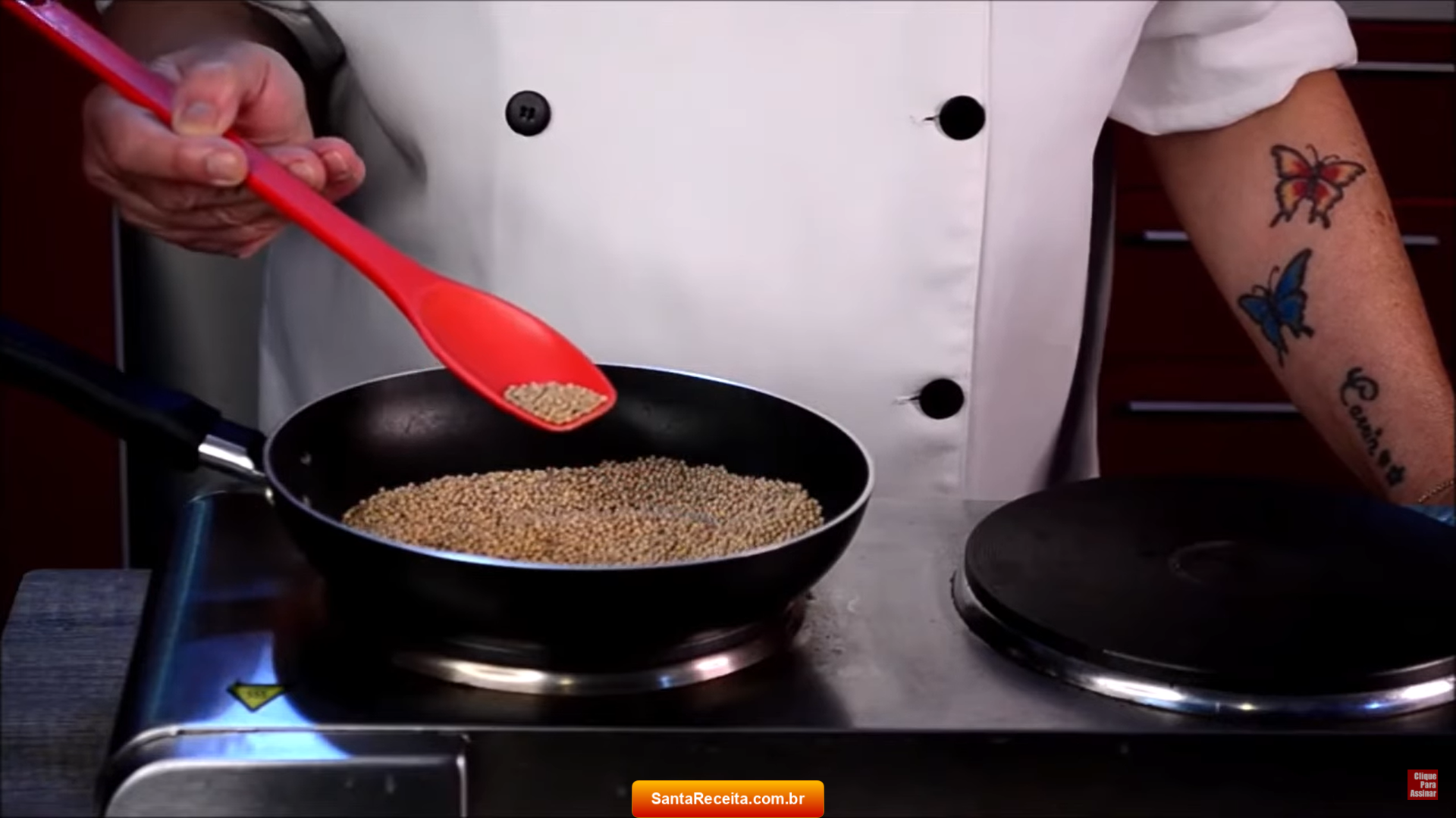 - Em uma frigideira quente adicione as sementes de mostarda.