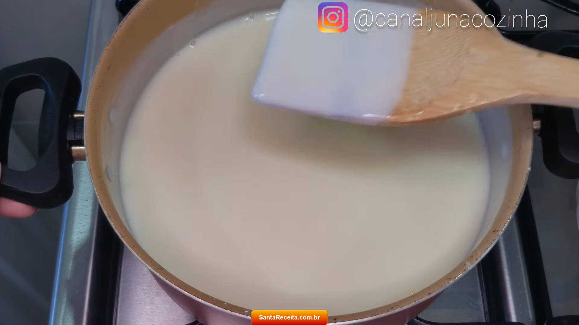 - Adicione o leite e misture novamente. Cozinhe em fogo baixo mexendo bem até engrossar um pouco e desligue o fogo.