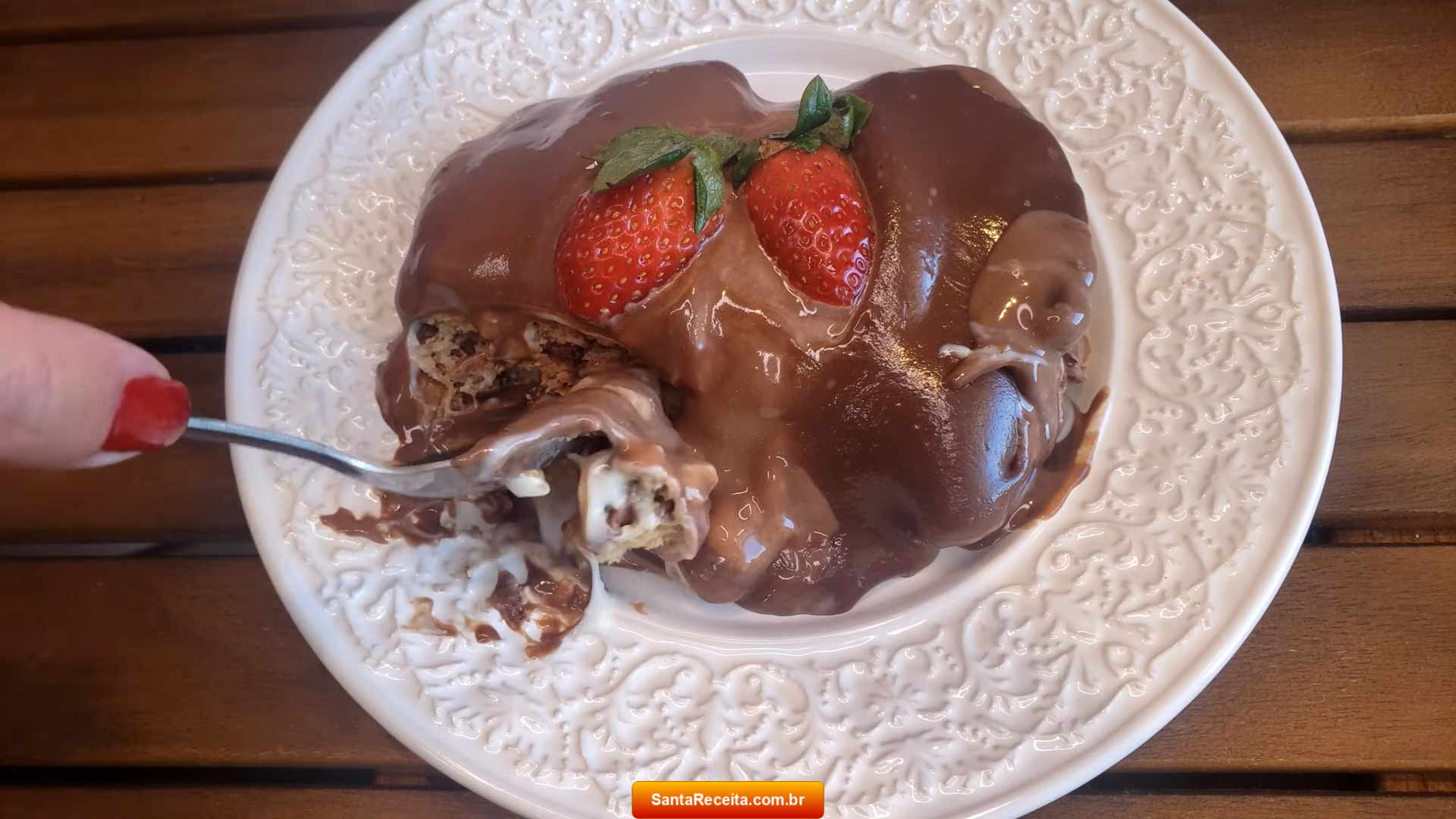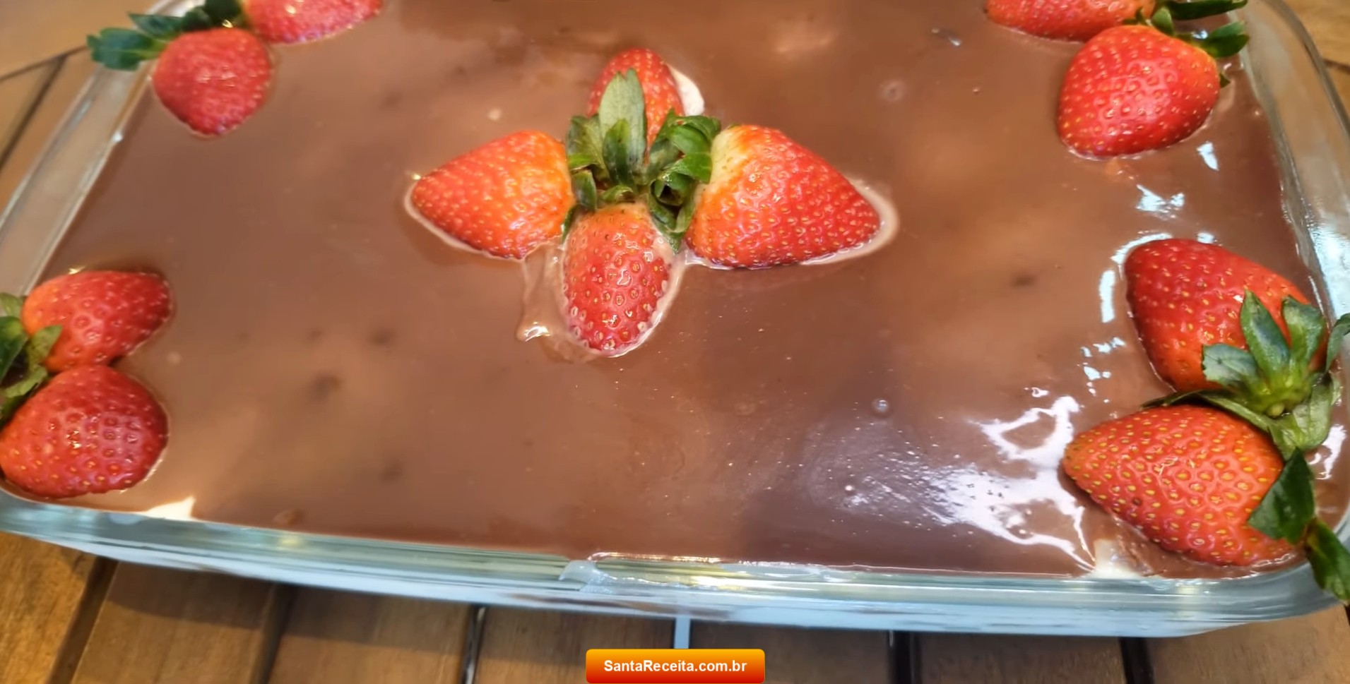 - Decore a sobremesa com morangos a gosto da forma que preferir e leve à geladeira por algumas horas.