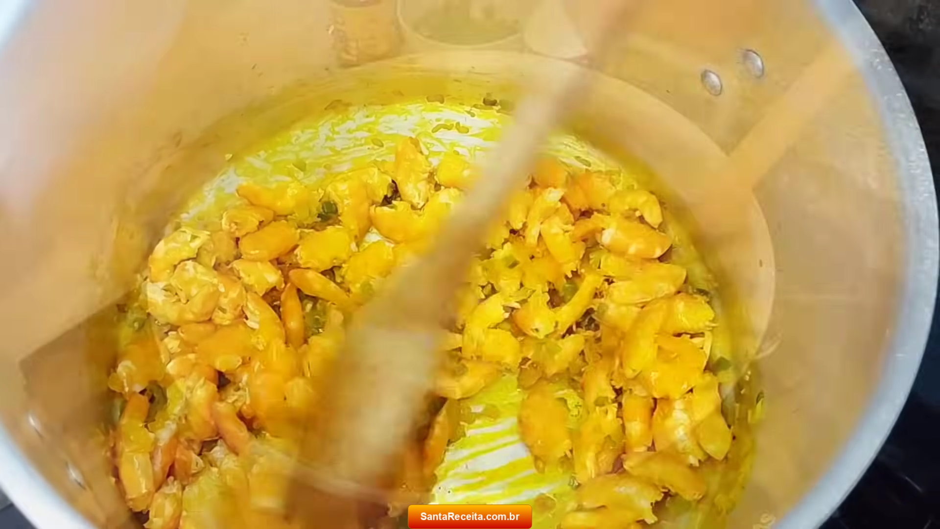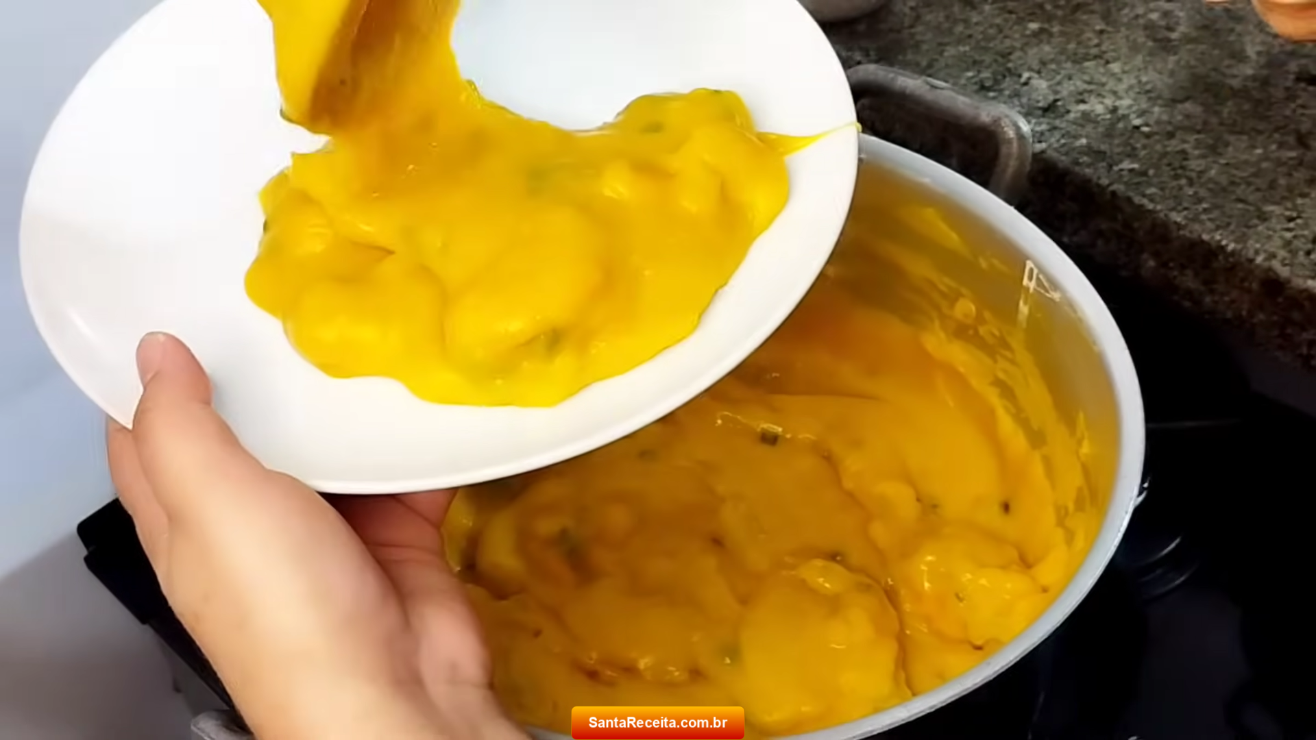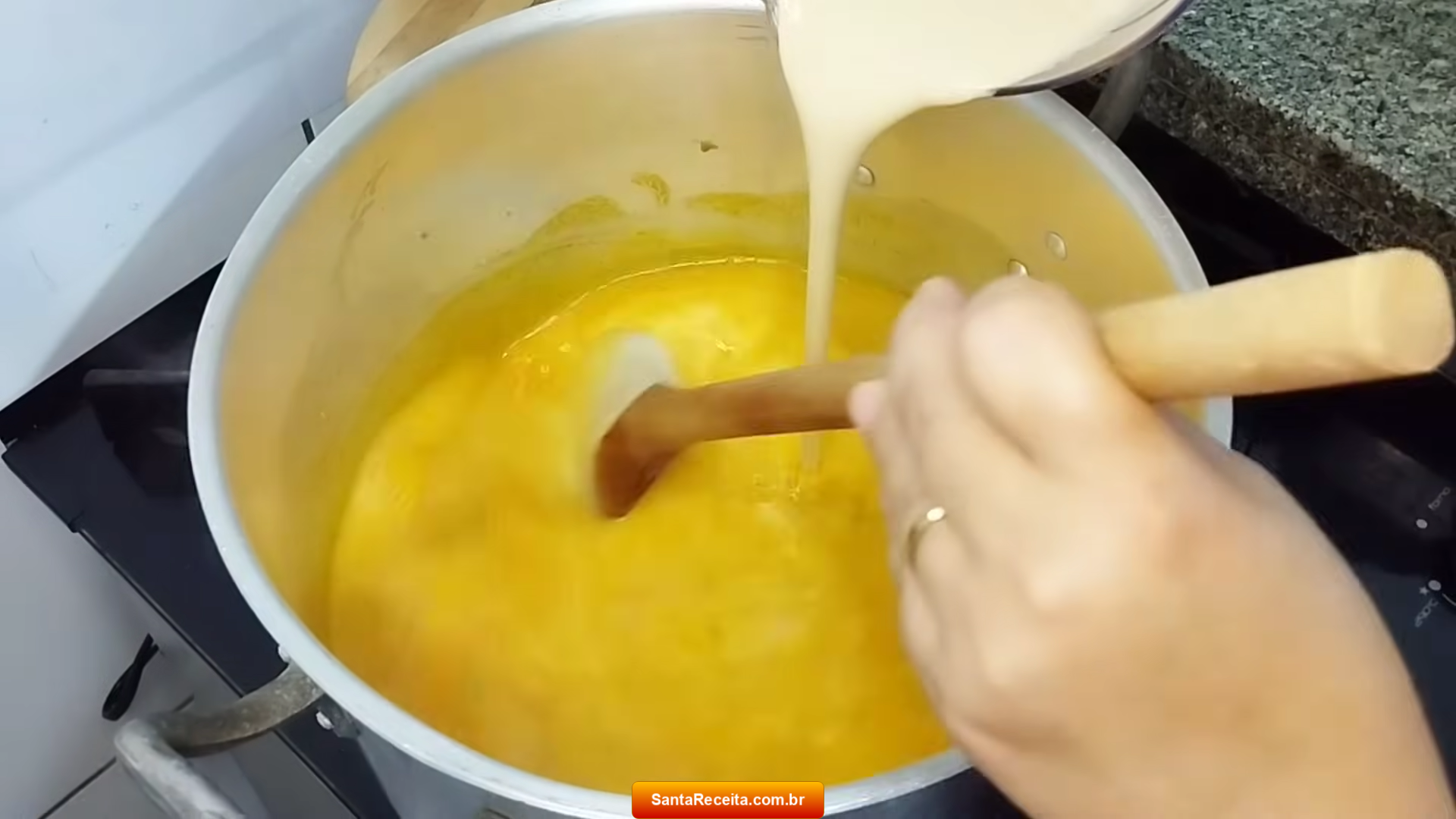 - No liquidificador bata bem o caldo que foi reservado com a farinha de trigo e transfira aos poucos para a panela enquanto mexe os ingredientes.
